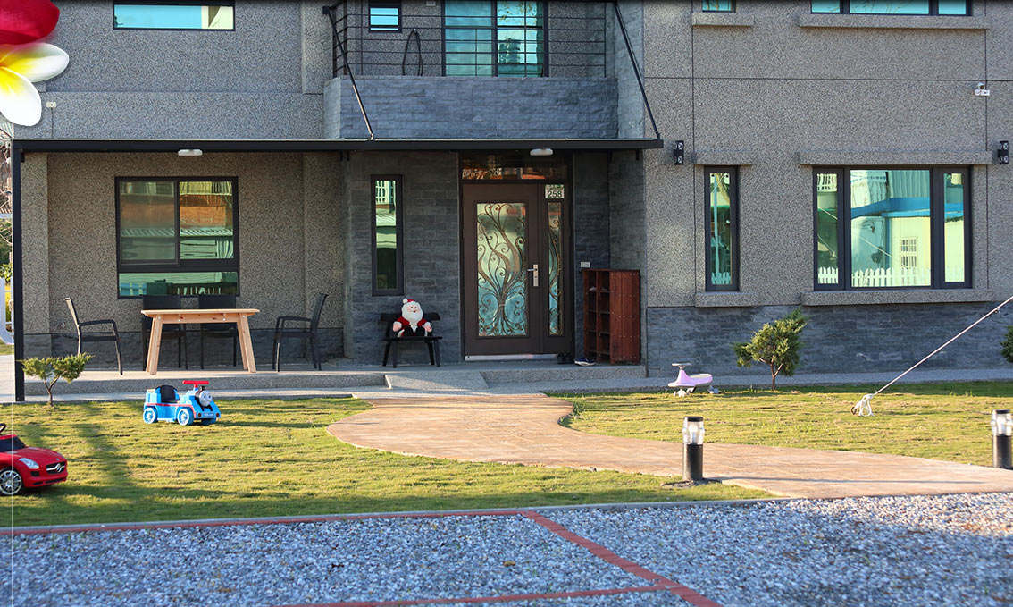 前後院的大草皮,讓人超想席地而坐,享受貼近大自然的感覺!前院有停車場,方便入住的客人停車,庭園裡有一棵樹形很美的光蠟樹,聽說是闆娘的最愛喔!還有小朋友最愛的電動玩具車,冠冕夢想館真的好適合大人小孩一起來玩喔!